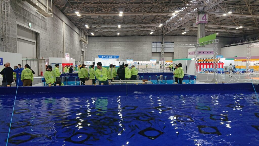 お客様の大多数は、フィッシングショーに訪れたファミリーのお子さんと、たまにお母さん。後ろでお父さんが応援というパターンです。10×20m程度のプールが2基設置され、1基あたり1度に12名で釣りができる体制。サポーター1名あたり1日19名を担当します。