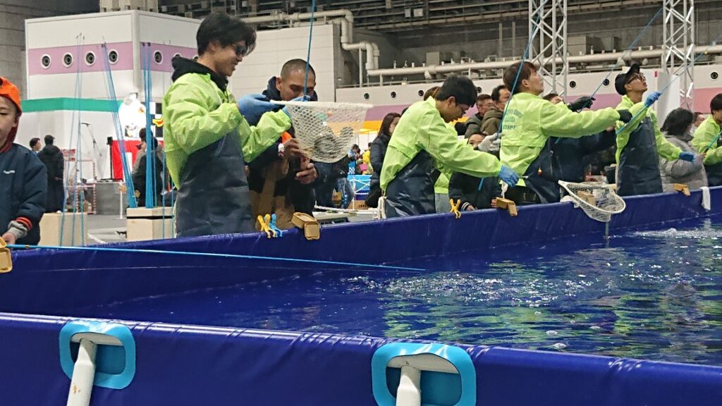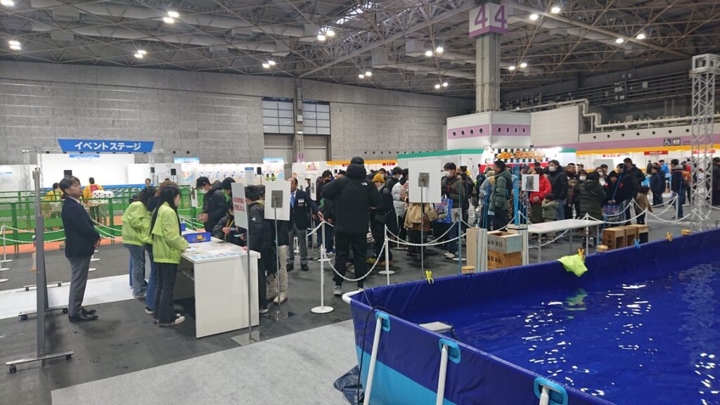 フィッシングショー大阪 4号館イベントホール 体験マス釣り。2027年もきっとあるはずですので、ご興味がおありの方はぜひ!開催が近づくと(12月頃?)インターネットでの前売り券販売もされているようなので。あ、高校生以上の男性は「釣禁」ですからw