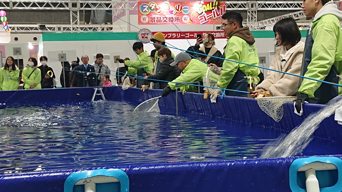 フィッシングショー大阪 4号館イベントホール 体験マス釣り。2027年もきっとあるはずですので、ご興味がおありの方はぜひ!開催が近づくと(12月頃?)インターネットでの前売り券販売もされているようなので。あ、高校生以上の男性は「釣禁」ですからw