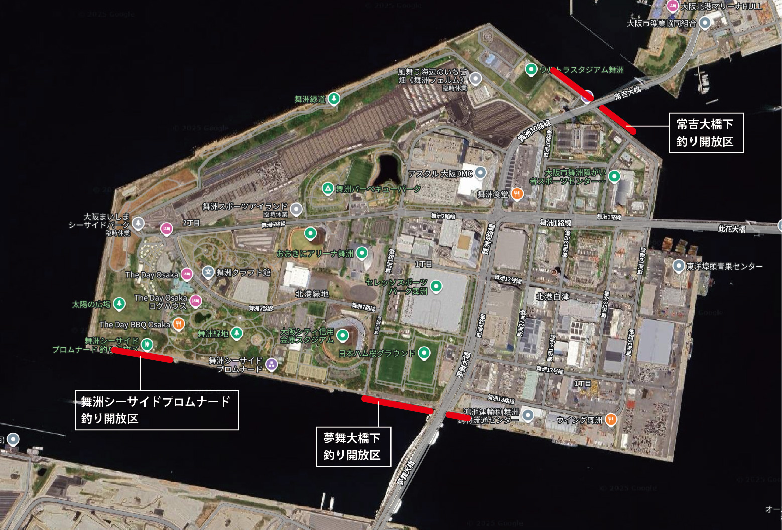 大阪港の埋立地、舞洲には2025年11月現在、3ヵ所の釣り開放区があります。